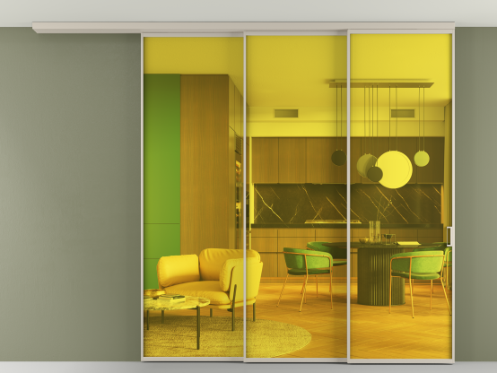 Мы предлагаем девять вариантов декоративного стекла: от кристально-прозрачного до матовых цветных, а также стёкла с эффектом Stopsol, когда лицевая сторона стекла зеркальная, но при включенном освещении за стеклом — становится прозрачной.
